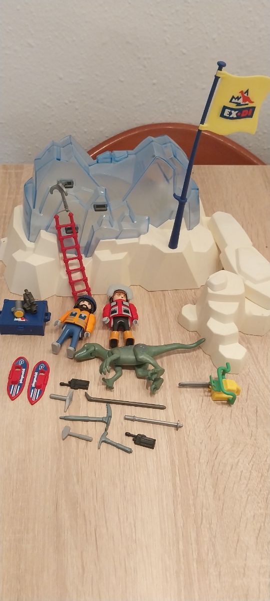 Detalles del productoPlaymobil Expedición Polar con dinosaurio. ¡Prepárate para una aventura ártica! Incluye dos figuras Playmobil, un dinosaurio, piolet, y otros accesorios. El set está en buen estado, con algunas marcas de uso.