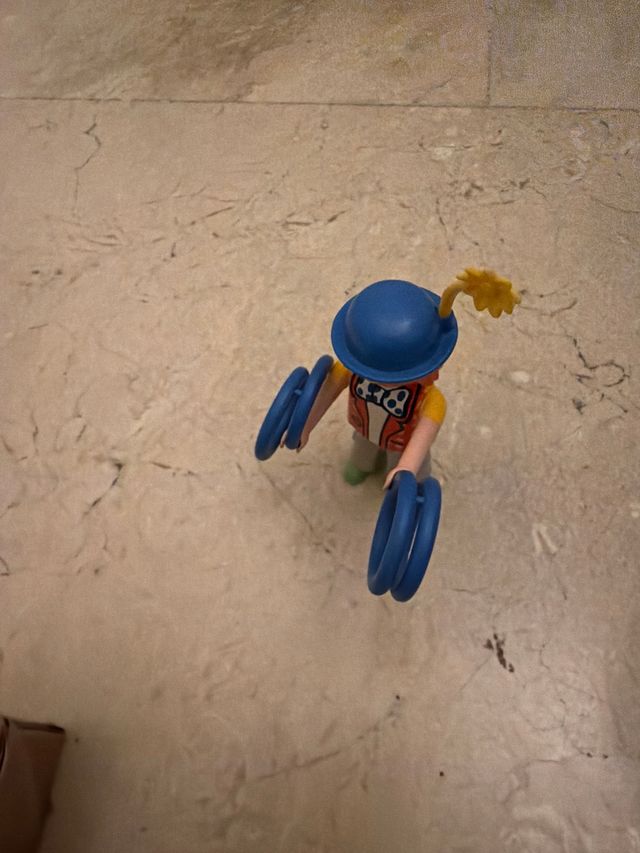 Figura de Playmobil de un payaso de circo. - Incluye sombrero azul. - Lleva un chaleco con detalles. - Accesorios de aros. - Pluma decorativa en el sombrero.