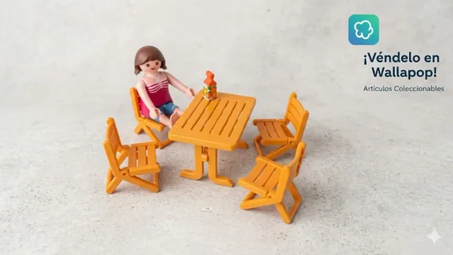 Set de Playmobil para un picnic o reunión al aire libre. Incluye una figura y mobiliario. - Figura de Playmobil. - Mesa de picnic. - Cuatro sillas. - Botella de bebida.
