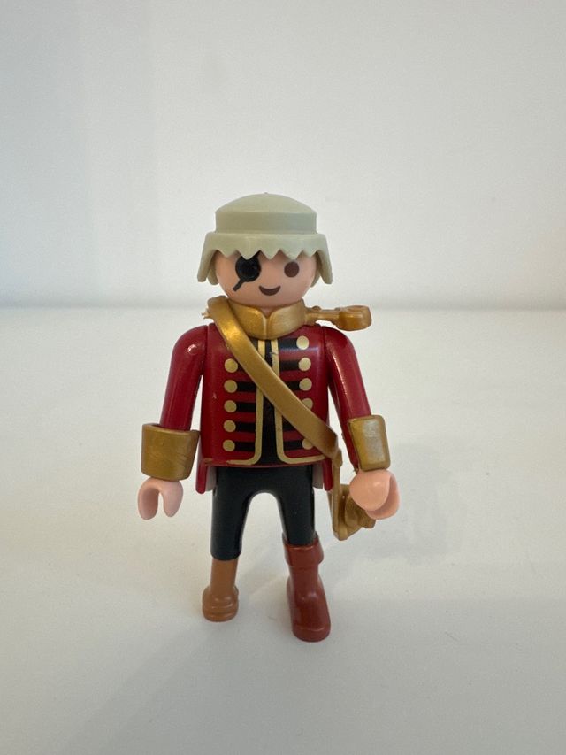 Figura de Playmobil de un pirata con atuendo de época. - Chaqueta roja con detalles dorados. - Pantalones negros. - Botas marrones. - Sombrero y parche en el ojo.