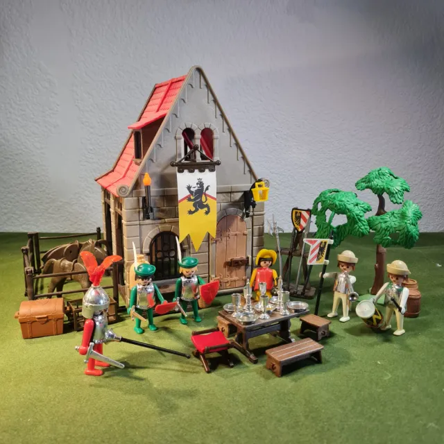 Detalles del productoConjunto de Playmobil que representa una posada medieval con varias figuras y accesorios.