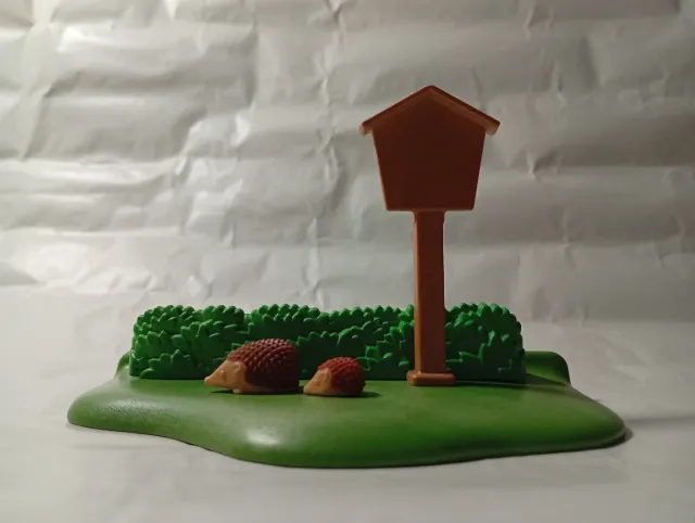 Set de Playmobil con temática de jardín y dos erizos. - Base verde con forma de terreno. - Seto verde. - Casa de madera para pájaros.