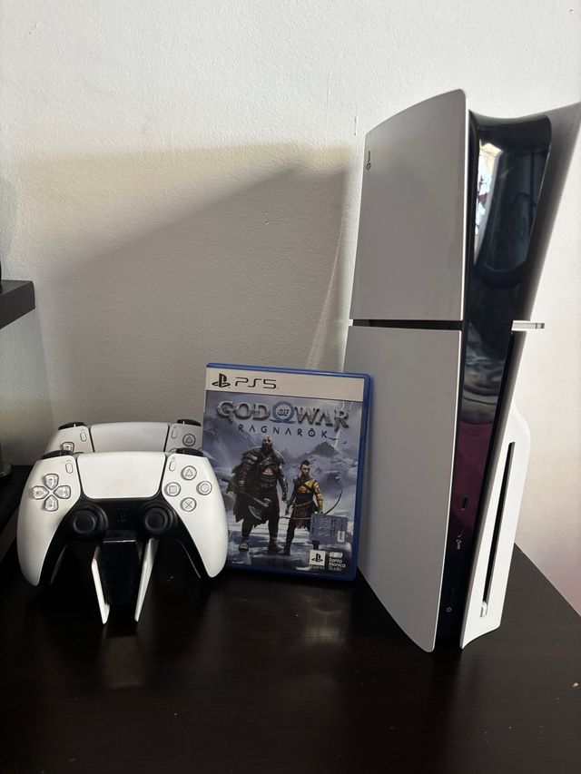 Detalles del productoConsola Playstation 5 con lector de disco en color blanco, junto con dos joysticks, una estación de carga y juego de god of war ragnarok