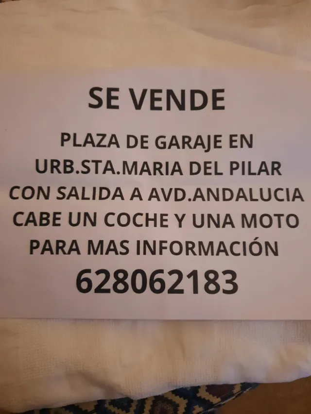 Detalles del productoSe Vende plaza de garaje en la Ur Santa Maria del Pilar con salida a la Avenida Andalucia cabe un coche y una moyo es amplia y muy buen asceso mas informacion por telefono 628062183 gracias