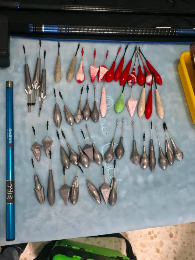 Detalles del productoLote de plomadas de pesca de diferentes formas y tamaños.