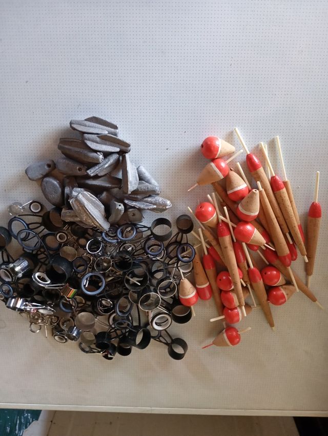 - Corchos de pesca con detalles en rojo y blanco. Hay un total de 33 corchos veinte plomos y 82 anillas diferentes tamaños de porcelana