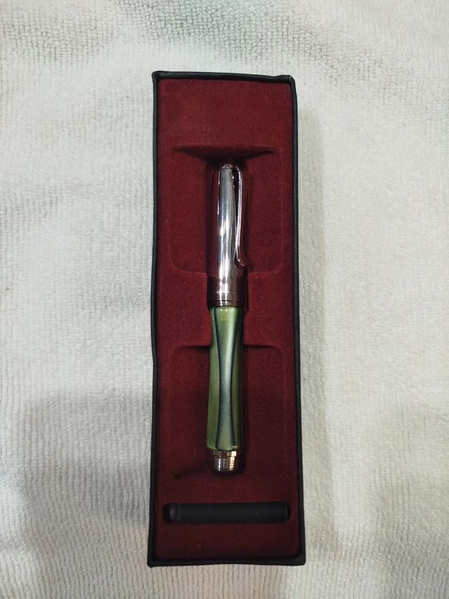preciosa y elegante pluma estilográfica verde y plateado con punta de Iridium.