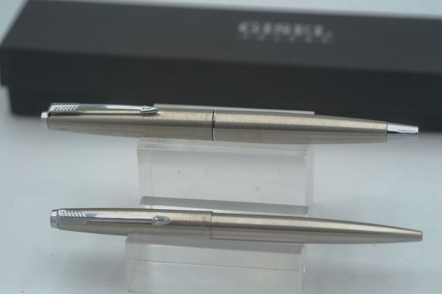 Detalles del productoElegante juego de escritura Parker 45. Incluye una estilográfica y un bolígrafo. Ambos en color plata, con un diseño sobrio y estilizado. - Estilográfica Parker 45 Flighter. - Bolígrafo Parker 45. -Construcción sólida en acero inoxidable y adornos cromados- En perfecto estado estético y de funcionamiento.(El bolígrafo tiene el recambio en uso y en tinta azul)