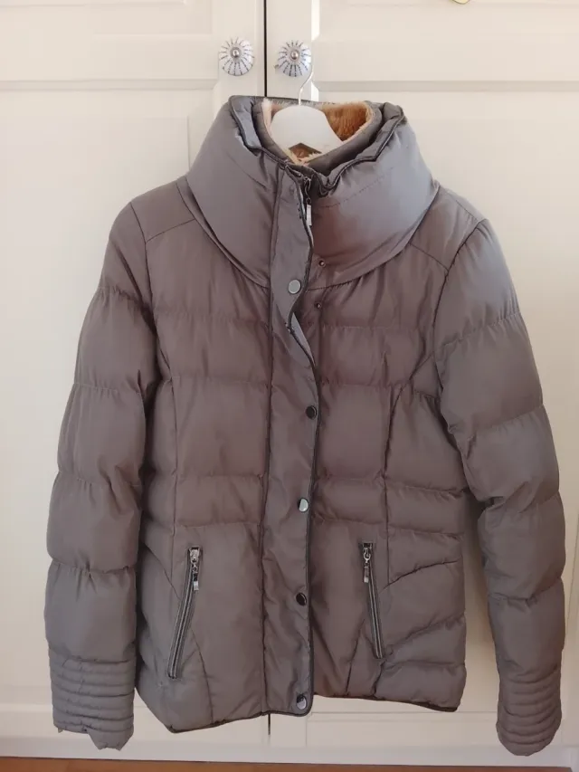 Plumífero de doble cuello con símil de pelaje. Color marrón grisáceo. Perfecto estado, nunca usado. Tejido impermeable.