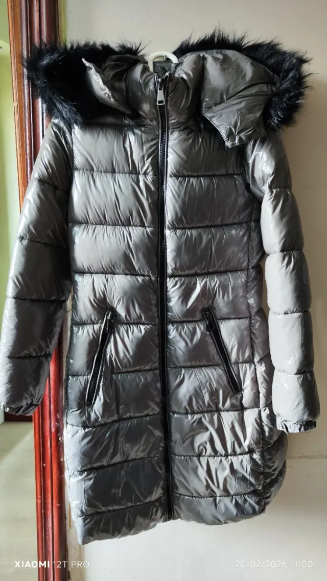 Plumífero gris con capucha y pelo