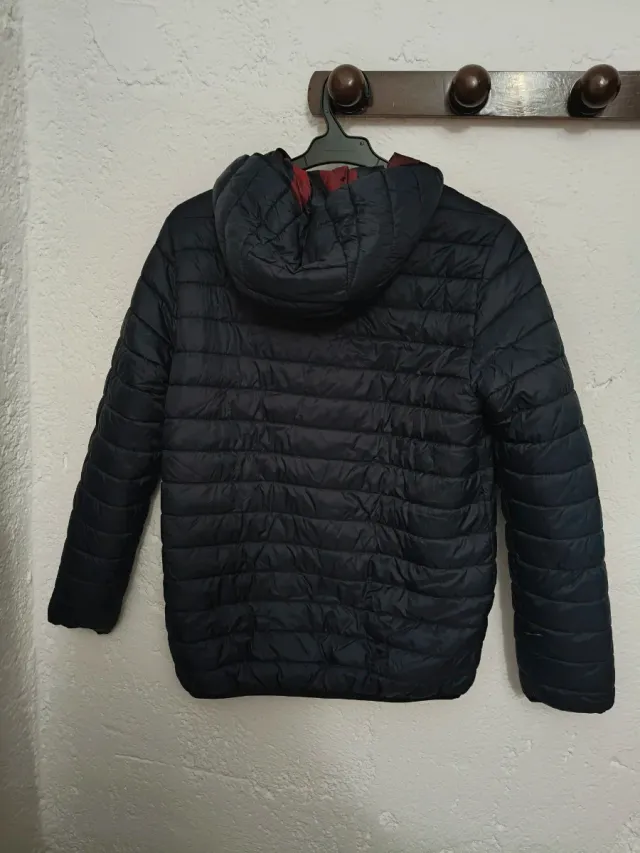 Chaqueta infantil reversible, ideal para abrigar en días fríos. - Exterior azul marino. - Interior a cuadros en tonos rojos y negros.