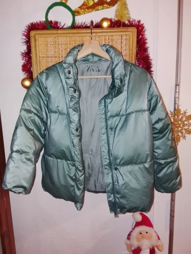 Plumón verde de la marca Zara. Es una prenda acolchada con un acabado brillante. - Cierre de cremallera. - Cuello alto. - Bolsillos laterales.
