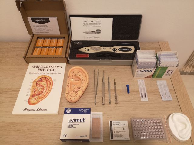 Detalles del productoSe vende electroestimulador y buscapuntos de acupuntura, con caja de pilas, y libro de auriculoterapia práctica a estrenar. Más pequeño kit de básicos de auriculoterapia. Todo está en perfecto estado.