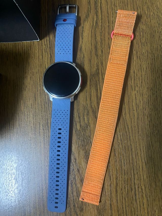 Smartwatch Polar V3 con correas intercambiables. - Correa azul con perforaciones. - Correa naranja de tela.original