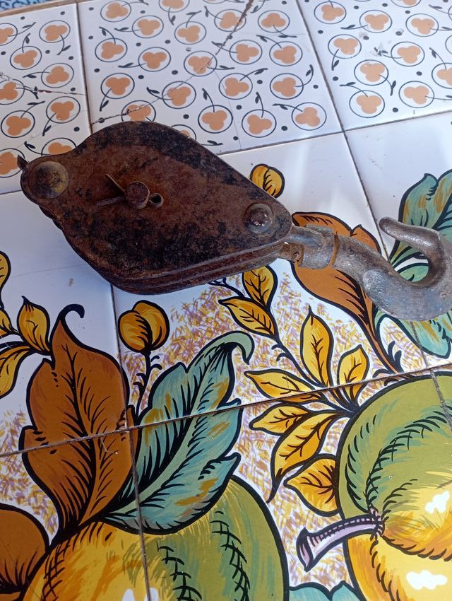 Detalles del productoPolea doble antigua fabricada en hierro fundido. Presenta un diseño robusto y clásico.