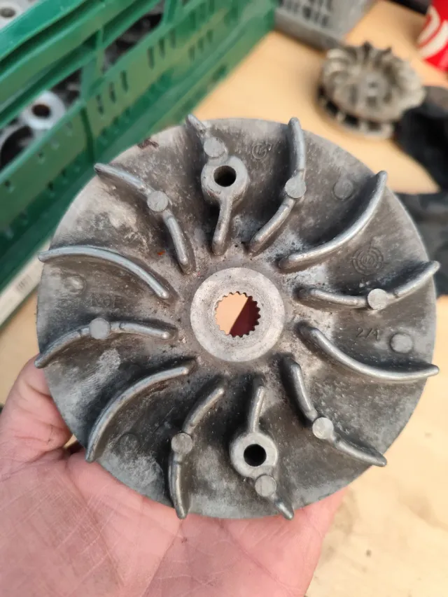 Polea para variador de moto Honda de 125cc y 150cc. - Pieza metálica con diseño de aspas. - Orificio central estriado para el eje. - Marcaje '271' visible.