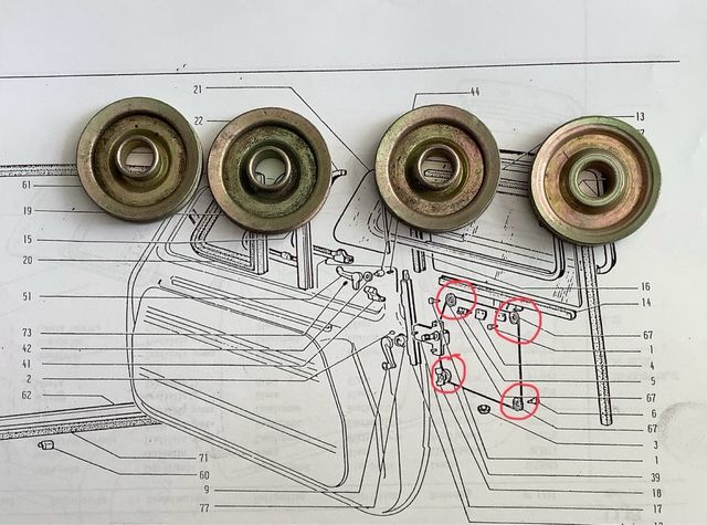 Cuatro poleas de elevalunas para Seat 600. Nuevas almacen antiguo.