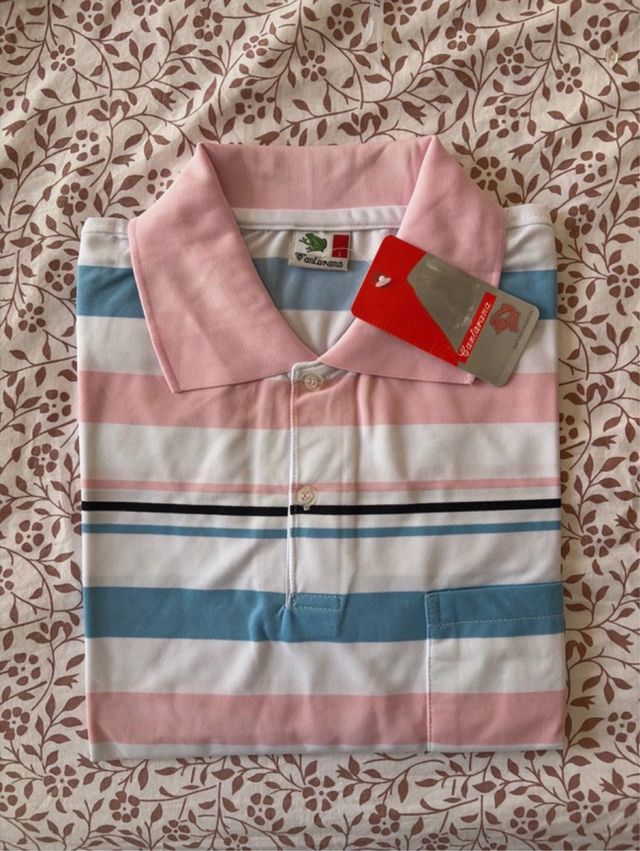 Polo de manga corta con un diseño a rayas en varios colores. Cuello camisero y cierre de botones.