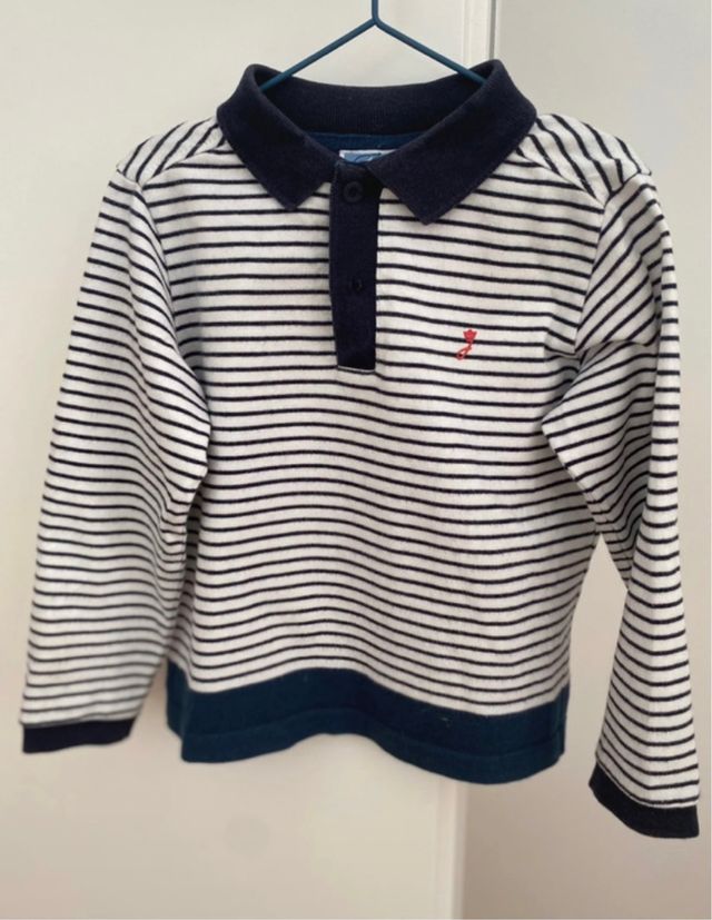 Detalles del productoPolo rayas manga larga, azul marino y blanco. Marca Jacadi talla 24 meses ( 2 años). No lleva etiqueta con talla porque se cortó en su momento porque molestaba al niño.