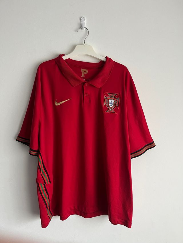Polo de la selección de Portugal. - Color rojo. - Logo de Nike bordado. - Escudo de Portugal en el pecho. - Talla XL.