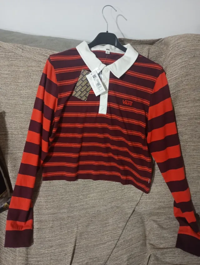 Polo de manga larga con cuello blanco y rayas rojas y granates. Un diseño clásico de la marca.