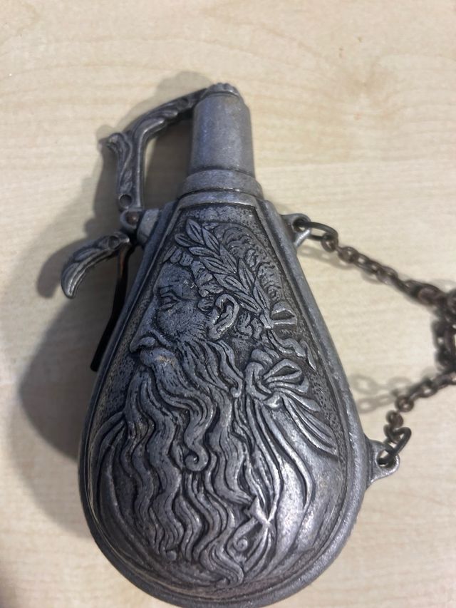 Polvera vintage con un intrincado grabado de un rostro con barba y laureles. - Material metálico. - Diseño con cadena. - Detalles ornamentales.