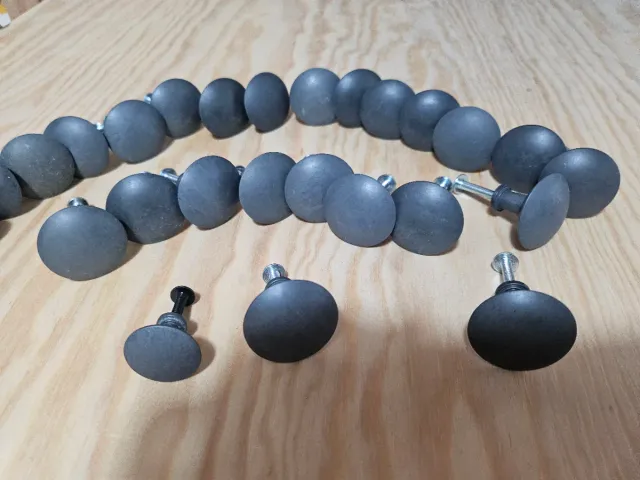 Lote de 25 tiradores de Ikea y 1 mas pequeño. Total 26 unidades. - Color gris oscuro. - Diseño redondo y liso. - Incluyen tornillos para su instalación.