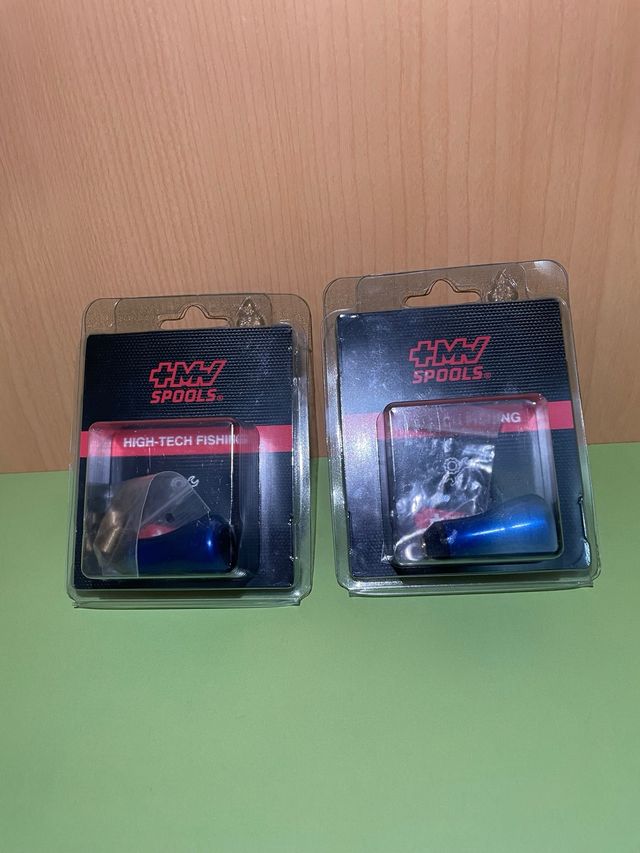 Detalles del productoDos pomos de recambio para carretes de pesca de la marca MVSpool. Son de color azul metálico y están diseñados para alta tecnología en pesca.