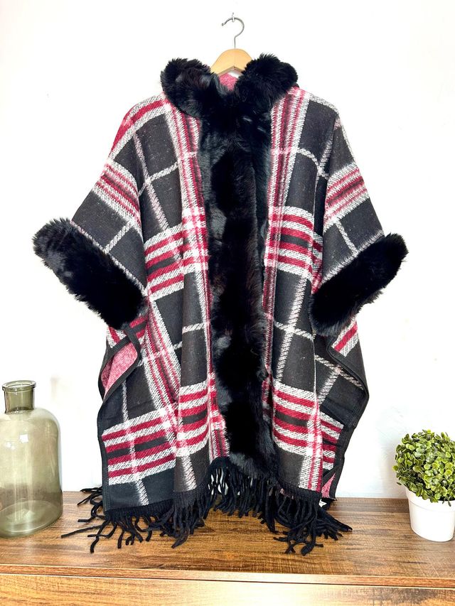 Poncho con capucha y pelo sintético