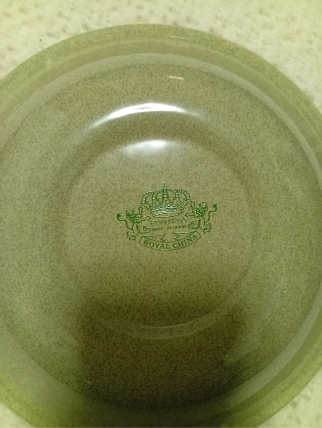 Plato de la marca Pontesa, modelo Royal China. Diseño con acabado moteado en tonos verdes. - Fabricado en España.