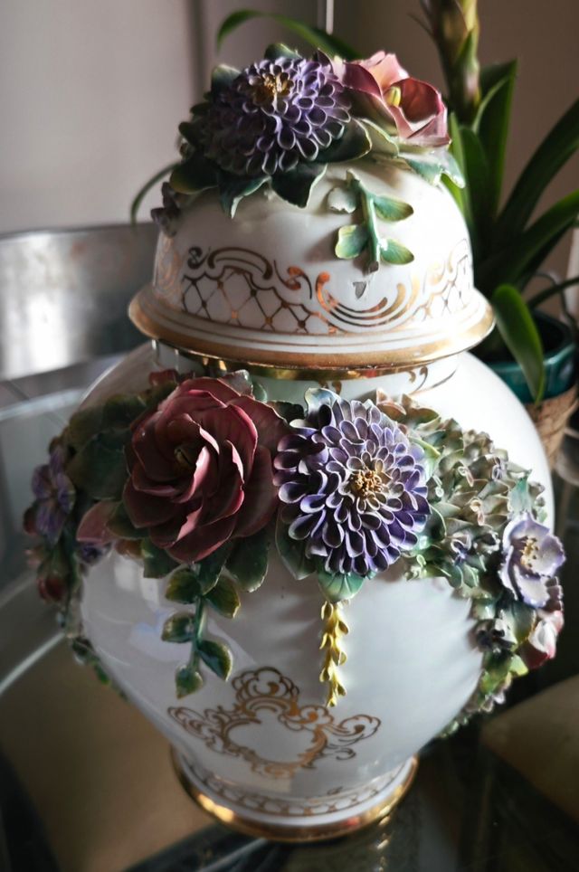 Con decoración de flores en relieve y realces dorados. Obra numerada.