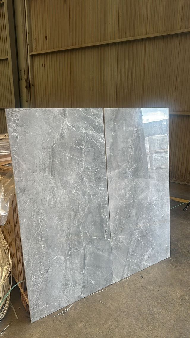 Baldosas de porcelánico con acabado gris pulido. - Medidas: 60x120 cm. - Diseño imitación mármol con veteado gris.