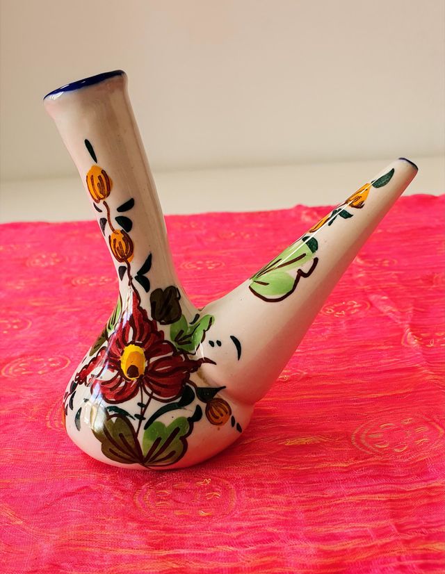 Detalles del productoPorrón de cerámica artesanal con un diseño floral pintado a mano. Ideal como pieza decorativa o para servir bebidas de forma original.