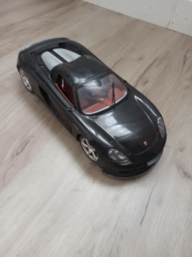 Coche de juguete Porsche con detalles deportivos. El alerón se puede subir. - Color negro. - Interior en rojo. - Ligeramente sucio.