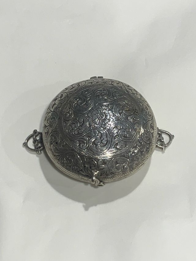 Detalles del productoCaja de plata porta amuletos o porta Corán. Auténtico y raro bazuband con elaborada decoración de carácter vegetal, originario de Oriente Medio. Alrededor de 1800.... En origen se ataba en la parta superior del brazo para proteger generalmente a un viajero. Pieza de colección para los amantes de la plata y del arte islámico. Buen estado de conservación. Medidas: 6 cm de diámetro. Peso: 43,6 g