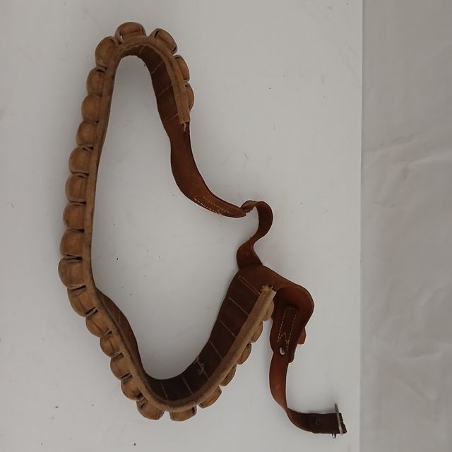 Bolsa porta balas de cuero antiguo. Ideal para coleccionistas. - Fabricada en cuero marrón. - Diseño clásico. - Contiene numerosos espacios para balas. - En buen estado de conservación.