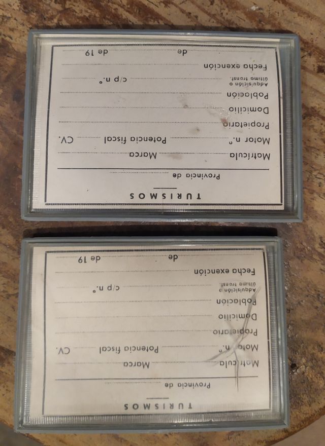Detalles del productoSe venden dos porta-cédulas para vehículos clásicos. Son de color gris, una tiene el plástico estallado y la otra tiene marcas de quemadura.