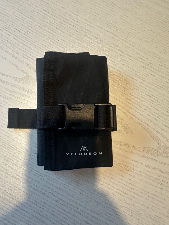 Porta herramientas para sillín de bicicleta de la marca Velodrom. - Color negro. - Cierre con clip. - Correa ajustable.