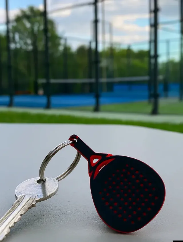 Llavero con diseño de pala de pádel. - Diseño en color negro y rojo. - Incluye una llave plateada.