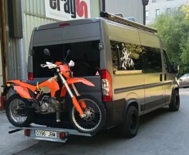 Porta moto para bola de remolque con capacidad de carga de 200kg. - Diseñado para transportar motocicletas. - Se acopla a la bola del remolque.