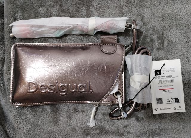 Detalles del productoMonedero estilo porta móvil, en tejido efecto piel, con acabado metalizado, logo efecto 3D, llavero extrañible y cierre de cremallera.