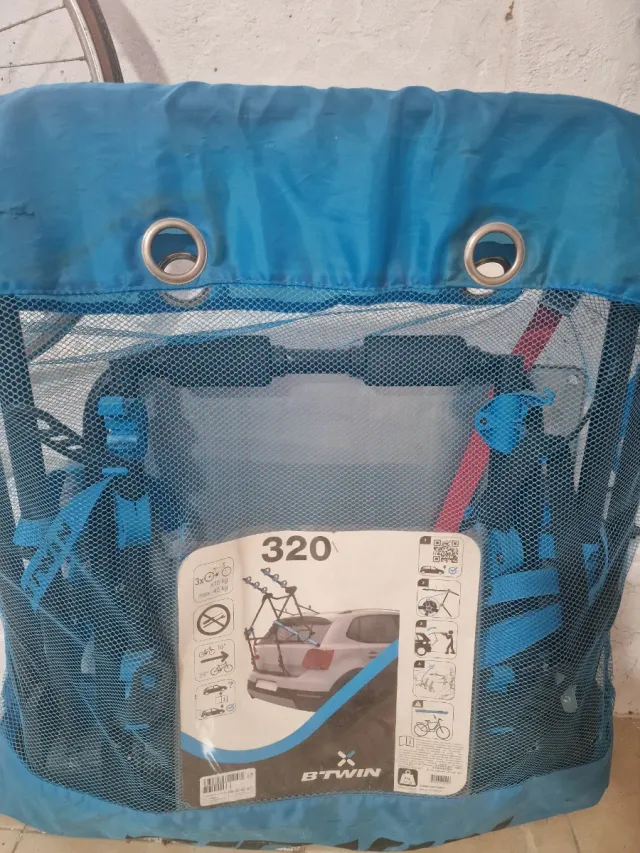 Detalles del productoPortabicicletas Btwin modelo 320, diseñado para transportar hasta 3 bicicletas en la parte trasera de un coche. Viene en su bolsa de almacenamiento.