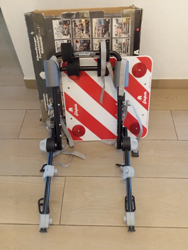 Portabicicletas Fapa con señal reflectante. - Estructura metálica. - Correas de sujeción. - Señal reflectante roja y blanca.