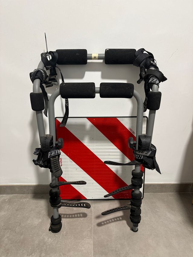 Detalles del productoPortabicicletas de la marca Mottez, incluye señal de advertencia.