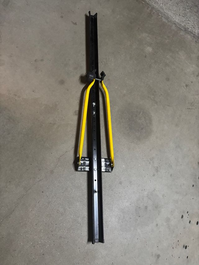 Soporte para bicicleta de color negro con detalles en amarillo. - Estructura metálica. - Brazos de sujeción amarillos.