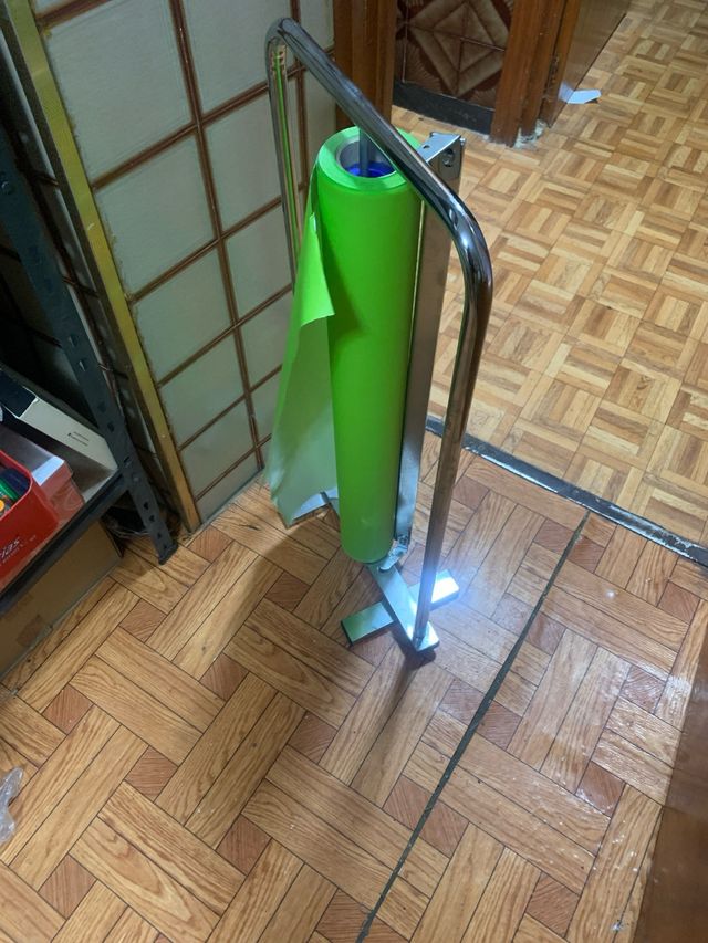 Soporte metálico para bobinas de papel. - Estructura de metal cromado. - Base estable en forma de cruz. - Diseñado para rollos de papel de regalo o vinilo.