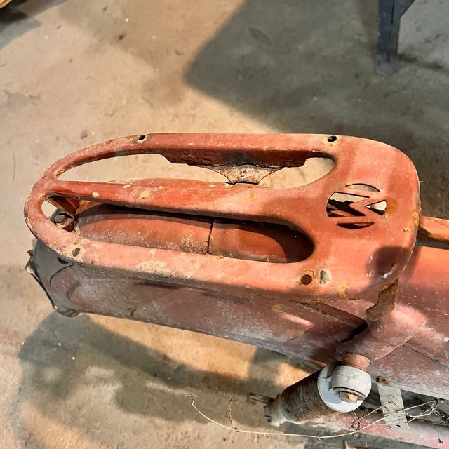 Portabultos para ciclomotor Mobylette 50cc. Pieza de recambio con acabado en color rojo y detalles oxidados. - Diseño robusto. - Ideal para restauración.