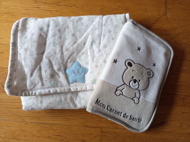 - portadocumentos con bordado de osito y texto Mon Carnet de Santé.