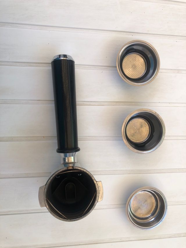Portafiltro para cafetera express y TRES cachitos para una taza, dos tazas y bolsitas. Muy poco usado. Marca DeLonghi.