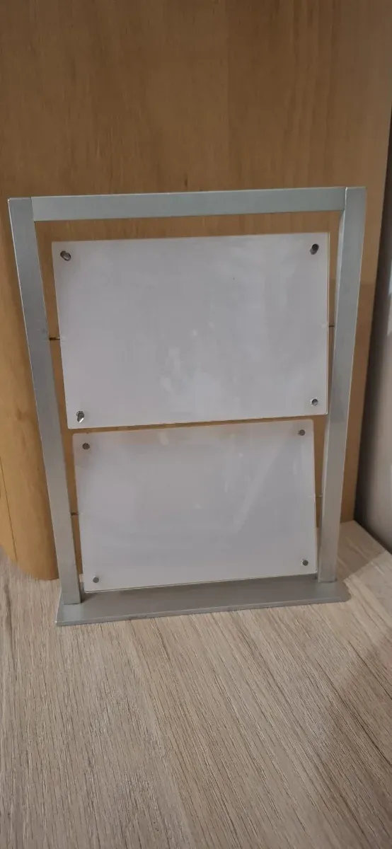 Portafotos giratorio con capacidad para 4 imágenes. Marco de metal plateado. Dos paneles para fotos. Base estable. Medidas: alto 26cm, ancho 18,5 cm, fondo 0,5 cm